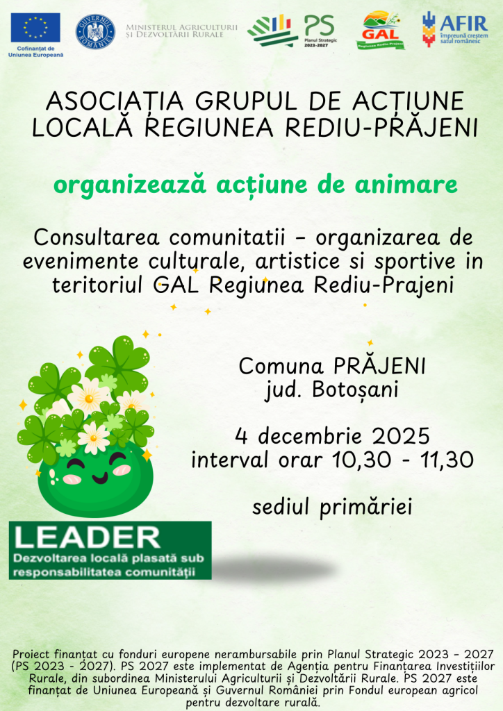 GAL Regiunea Rediu-Prăjeni desfășoară în această perioadă acțiuni de animare pentru consultarea comunității Rediu-Prăjeni, cu privire la necesitatea organizării de evenimente culturale, artistice și sportive. În data de 4 decembrie 2025, echipa GAL va fi prezentă în comunele Prăjeni, Plugari și Vlădeni.