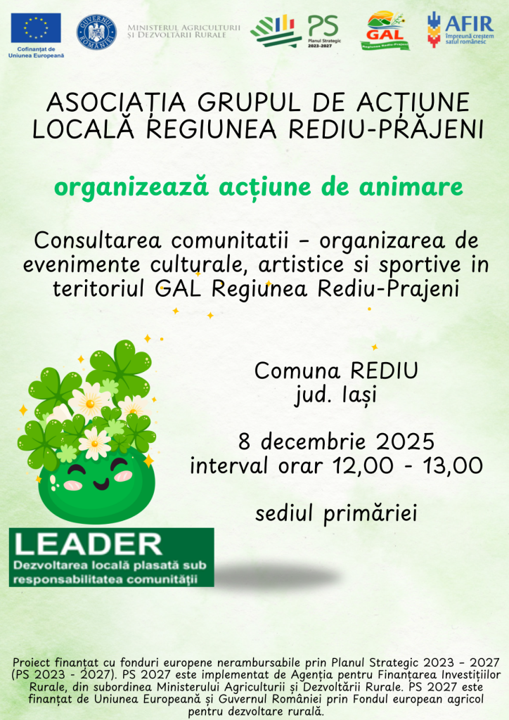 GAL Regiunea Rediu-Prăjeni desfășoară în această perioadă acțiuni de animare pentru consultarea comunității Rediu-Prăjeni, cu privire la necesitatea organizării de evenimente culturale, artistice și sportive. În data de 4 decembrie 2025, echipa GAL va fi prezentă în comunele Șipote, Gropnița și Movileni.