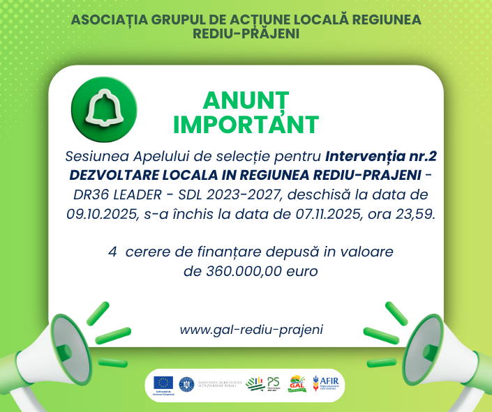 Anunț închidere apel de selecție Intervenția nr. 2 GAL Regiunea Rediu-Prăjeni13/11/202514/11/2025 Animare SDL 2023-2027 ← Calendar de animare – 4 decembrie 2025 DEALUL CU POVEȘTI, 13 septembrie 2025 →
