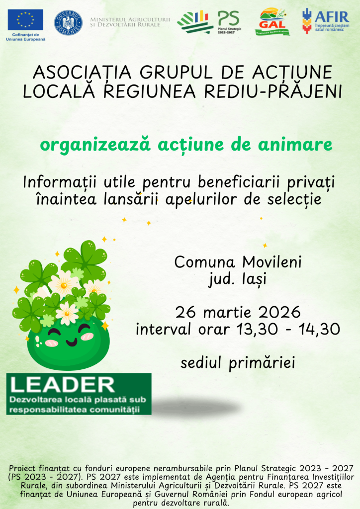 Acțiune de animare MOVILENI, 26 martie 2026 GAL Regiunea Rediu-Prăjeni16/03/202617/02/2026 Animare SDL 2023-2027 ← Lansare apel de selecție nr. 802/000/2/10/2026 – Intervenția nr. 5 – MODERNIZAREA COOPERATIVELOR AGRICOLE