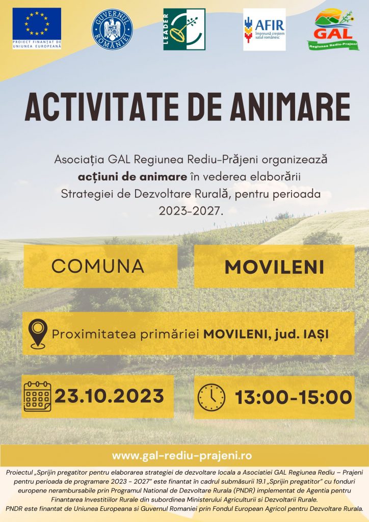 Proiectul „Sprijin pregatitor pentru elaborarea strategiei de dezvoltare locala a Asociatiei GAL Regiunea Rediu – Prajeni pentru perioada de programare 2023 – 2027” este finantat în cadrul submăsurii 19.1 „Sprijin pregatitor” cu fonduri europene nerambursabile prin Programul National de Dezvoltare Rurala (PNDR) implementat de Agentia pentru Finantarea Investitiilor Rurale din subordinea Ministerului Agriculturii si Dezvoltarii Rurale. PNDR este finantat de Uniunea Europeana si Guvernul Romaniei prin Fondul European Agricol pentru Dezvoltare Rurala.