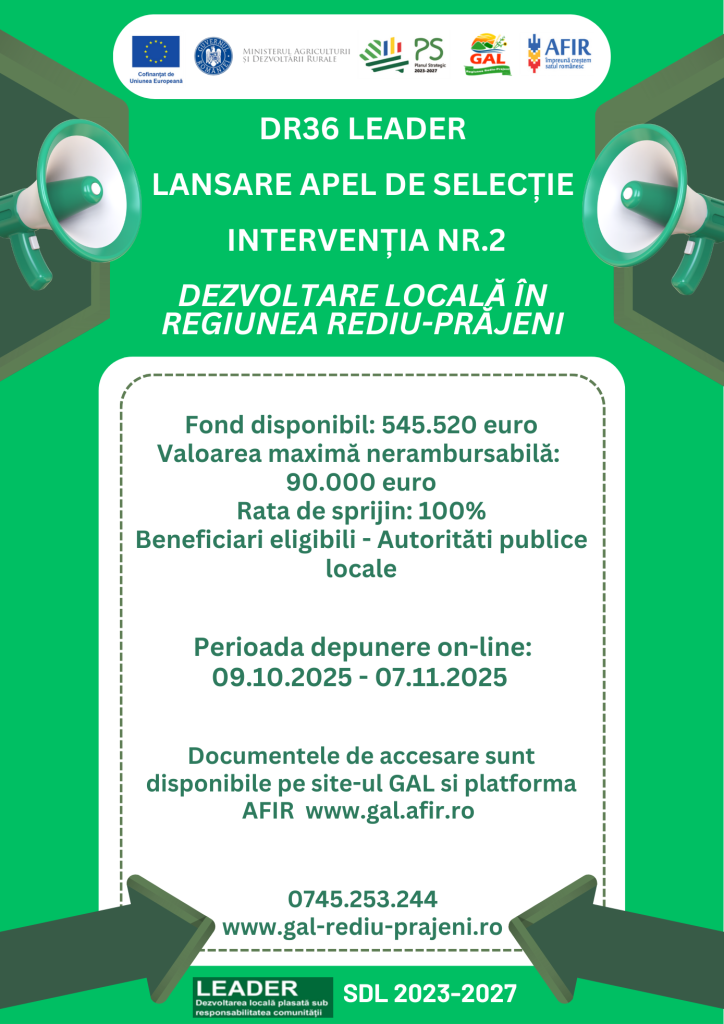 Lansare apel de selecție nr. 808/000/1/3/2025 – Intervenția nr. 2 – DEZVOLTARE LOCALA IN REGIUNEA REDIU-PRAJENI