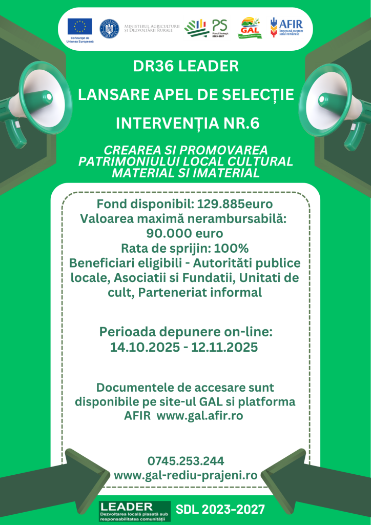 Asociația Grupul de Acțiune Locală Regiunea Rediu-Prăjeni anunță lansarea apelului de selecție pentru: