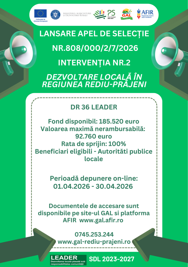 Asociația Grupul de Acțiune Locală Regiunea Rediu-Prăjeni anunță lansarea, în perioada 01.04.2026 – 30.04.2026, apelului de selecție pentru: