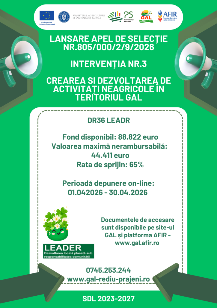 Asociația Grupul de Acțiune Locală Regiunea Rediu-Prăjeni anunță lansarea apelului de selecție pentru: