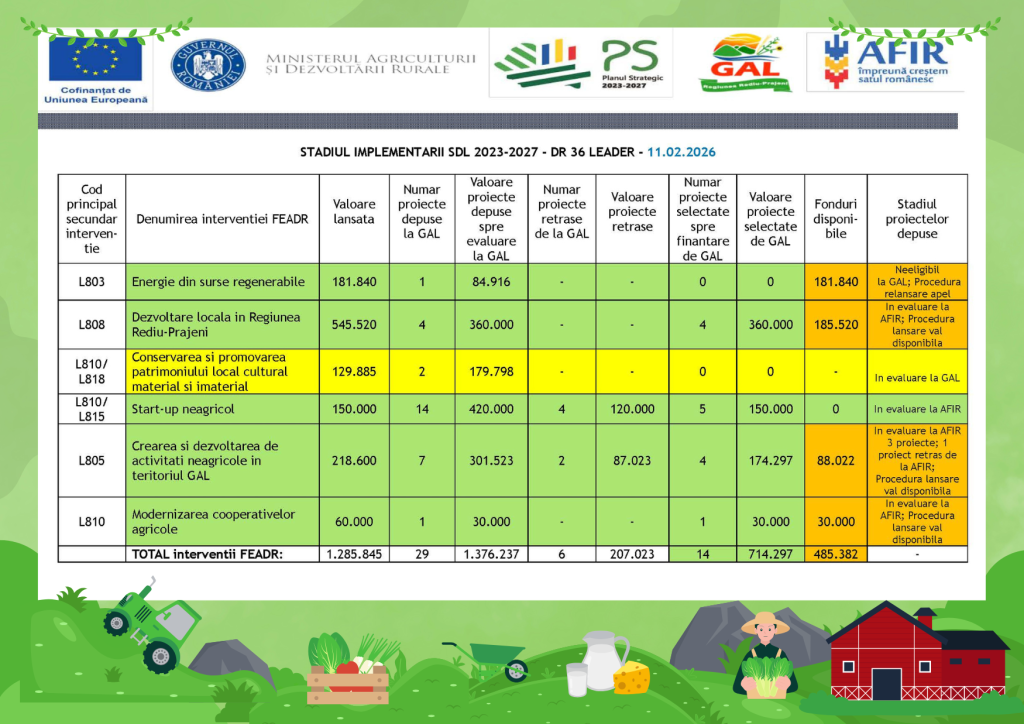 Stadiul implementării SDL 2023-2027 GAL Regiunea Rediu-Prăjeni11/02/202617/02/2026 Animare SDL 2023-2027 ← Raport de selecție FINAL – Intervenția nr. 7 – ENERGIE DIN SURSE REGENERABILE – Apel de selecție nr. 803/000/1/4/2025